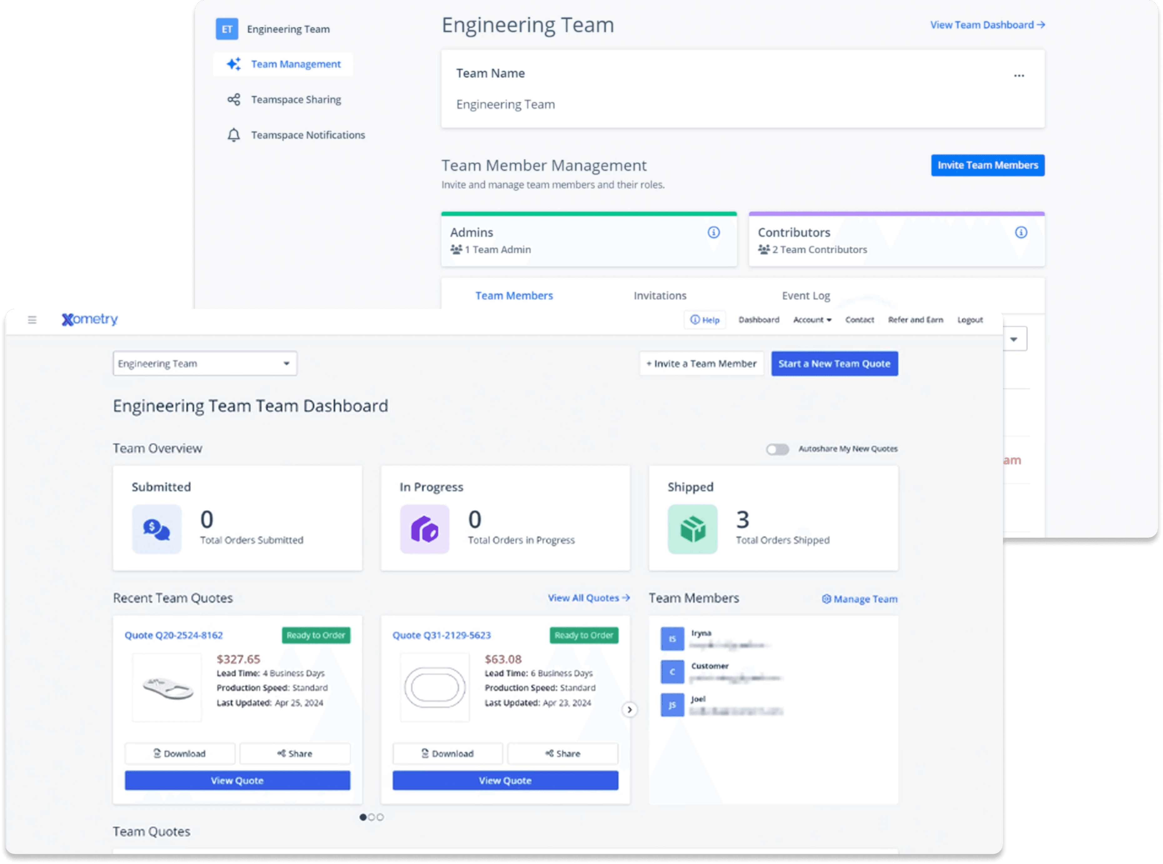 Xometry's first launch of Teamspace, a collaborative workspace enabling engineers, buyers, and procurement teams to seamlessly share quotes, place orders, and track manufacturing projects in a centralized workspace.