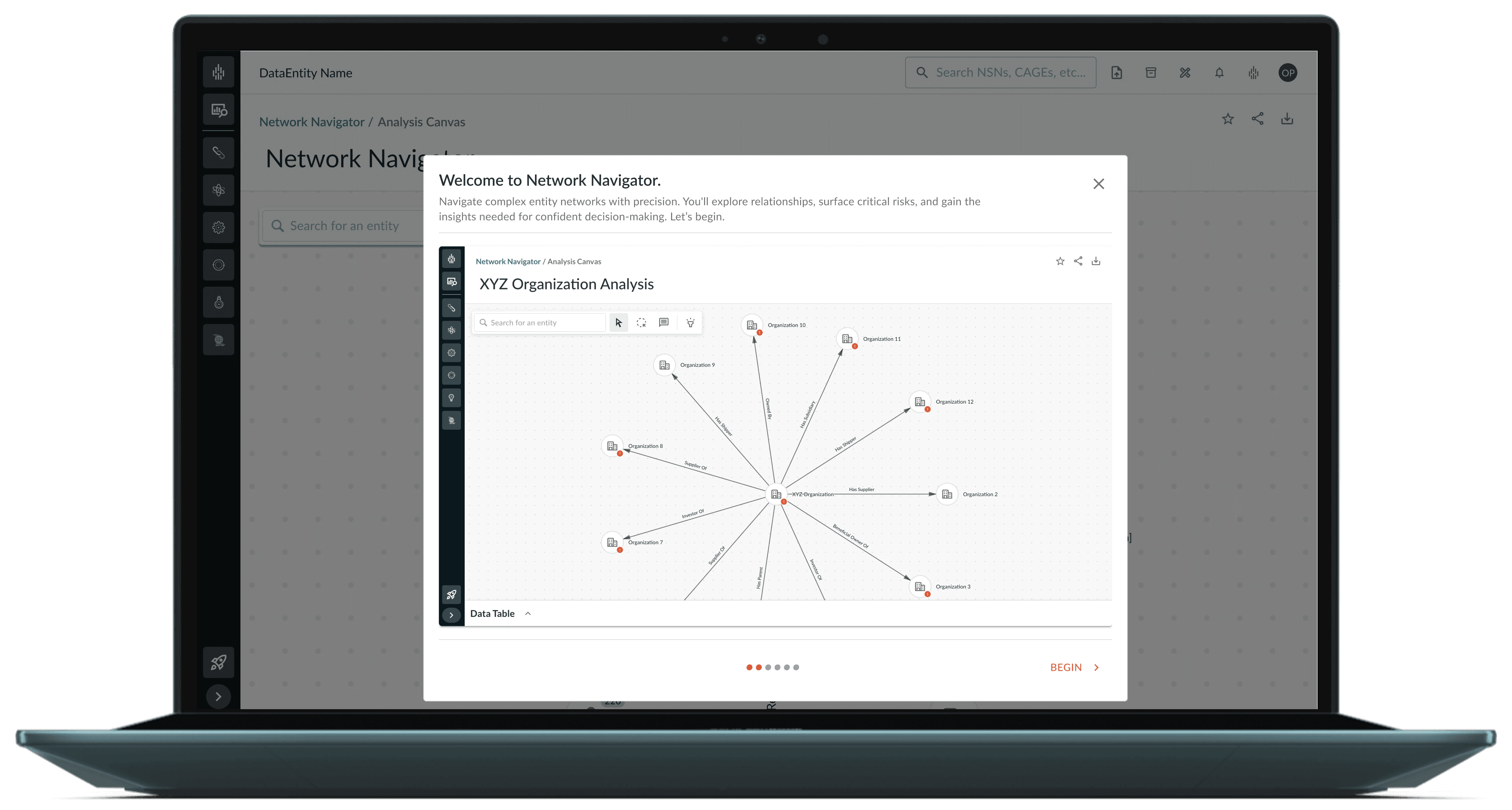 Supply Chain Risk Management (SCRM) Analysts needed to identify hidden vulnerabilities across multi-tier supplier networks, but existing database tools required hours of manual queries to trace entity relationships. Analysts couldn't visualize how risks cascaded through their industrial base or quickly respond to leadership requests for information. Through extensive research with SCRM Analysts and collaboration with Implementation Engineers (IEs), I designed Network Navigator: a graph-based intelligence workflow that surfaces hidden multi-tier vulnerabilities through interactive visualization, enabling SCRM Analysts to investigate supply chain risks in minutes instead of hours.