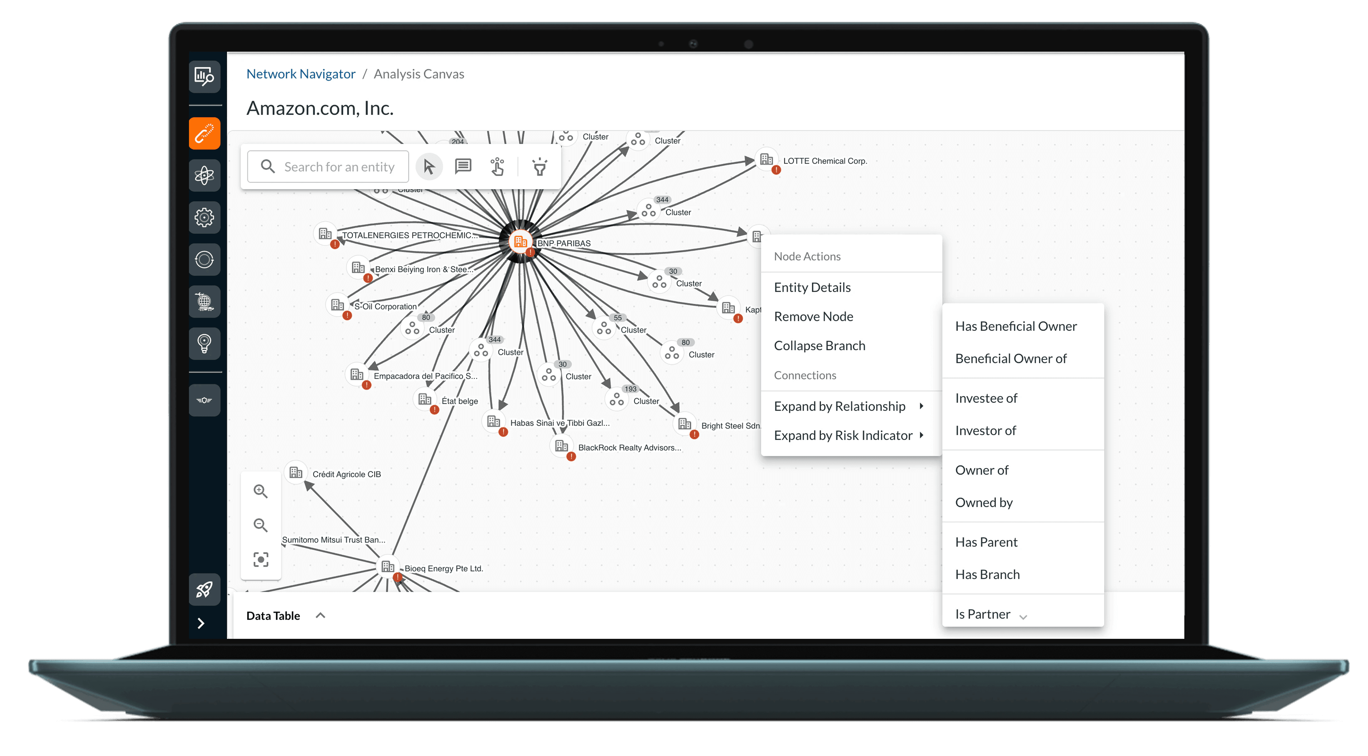 The context menu provides node-specific actions that adapt to the analyst's investigation focus. Analysts can expand entities by relationship type (suppliers, investors, beneficial owners, etc.) or by risk category (FOCI, financial health, compliance, etc.), allowing them to trace multiple tiers of connections and uncover hidden dependencies across their supply chain.