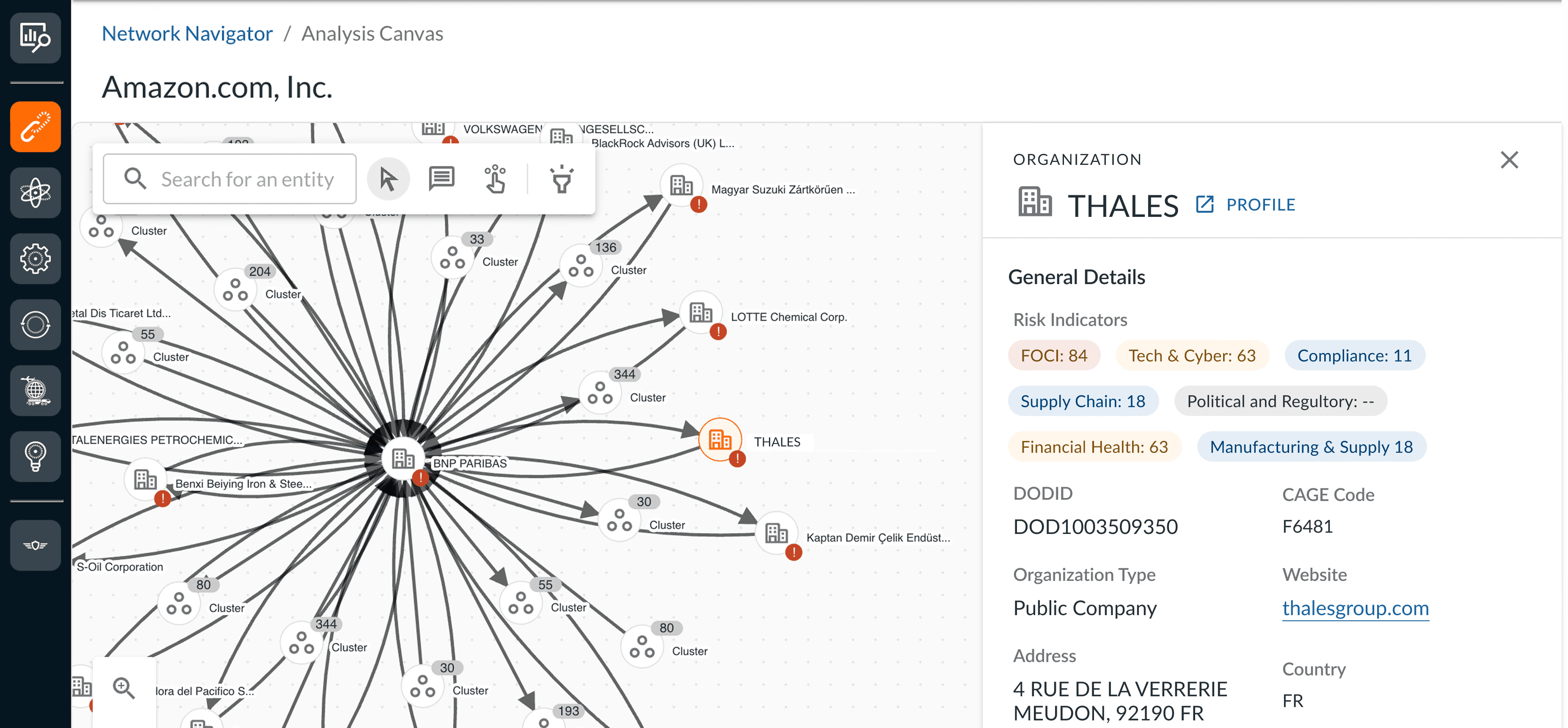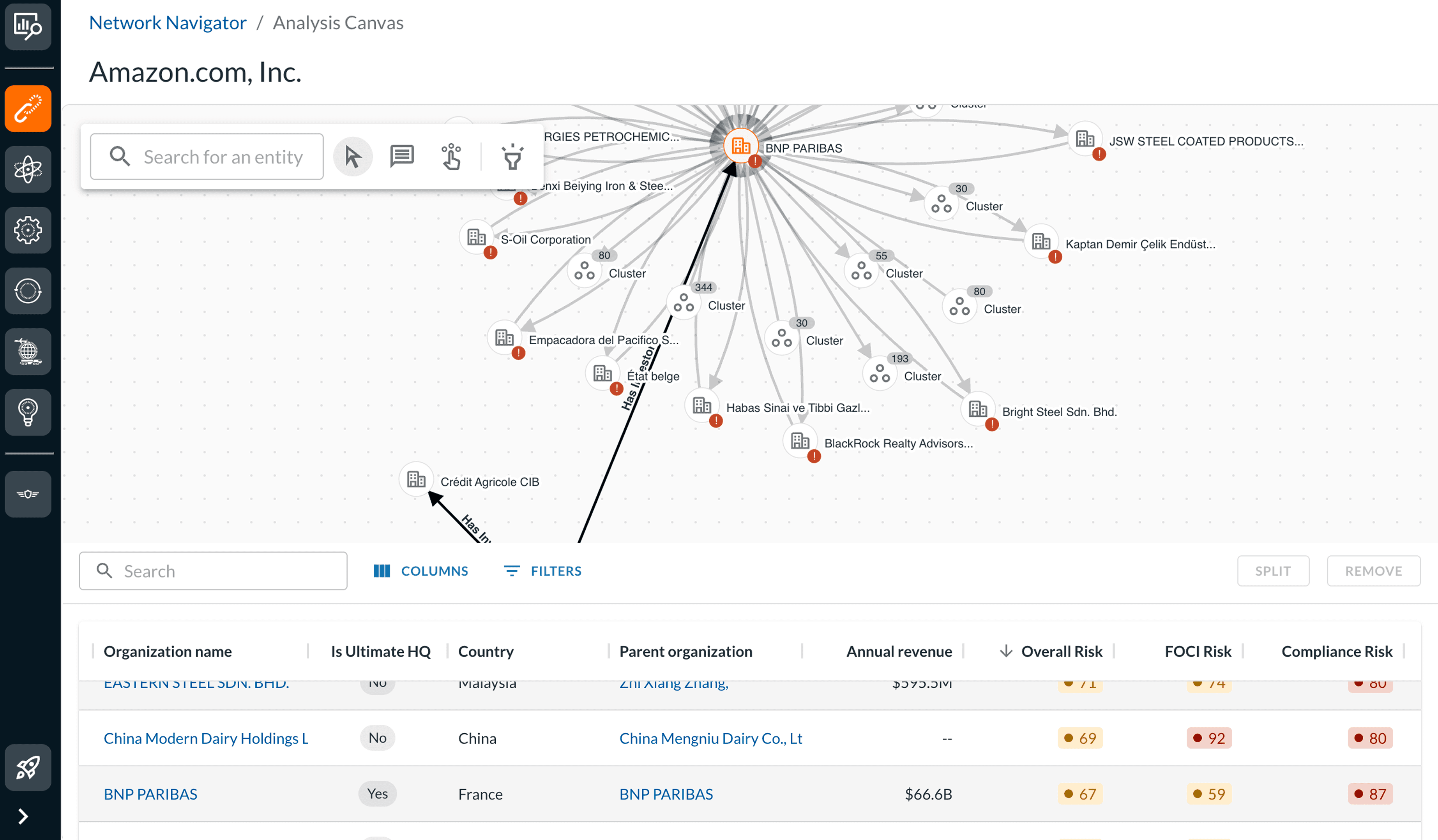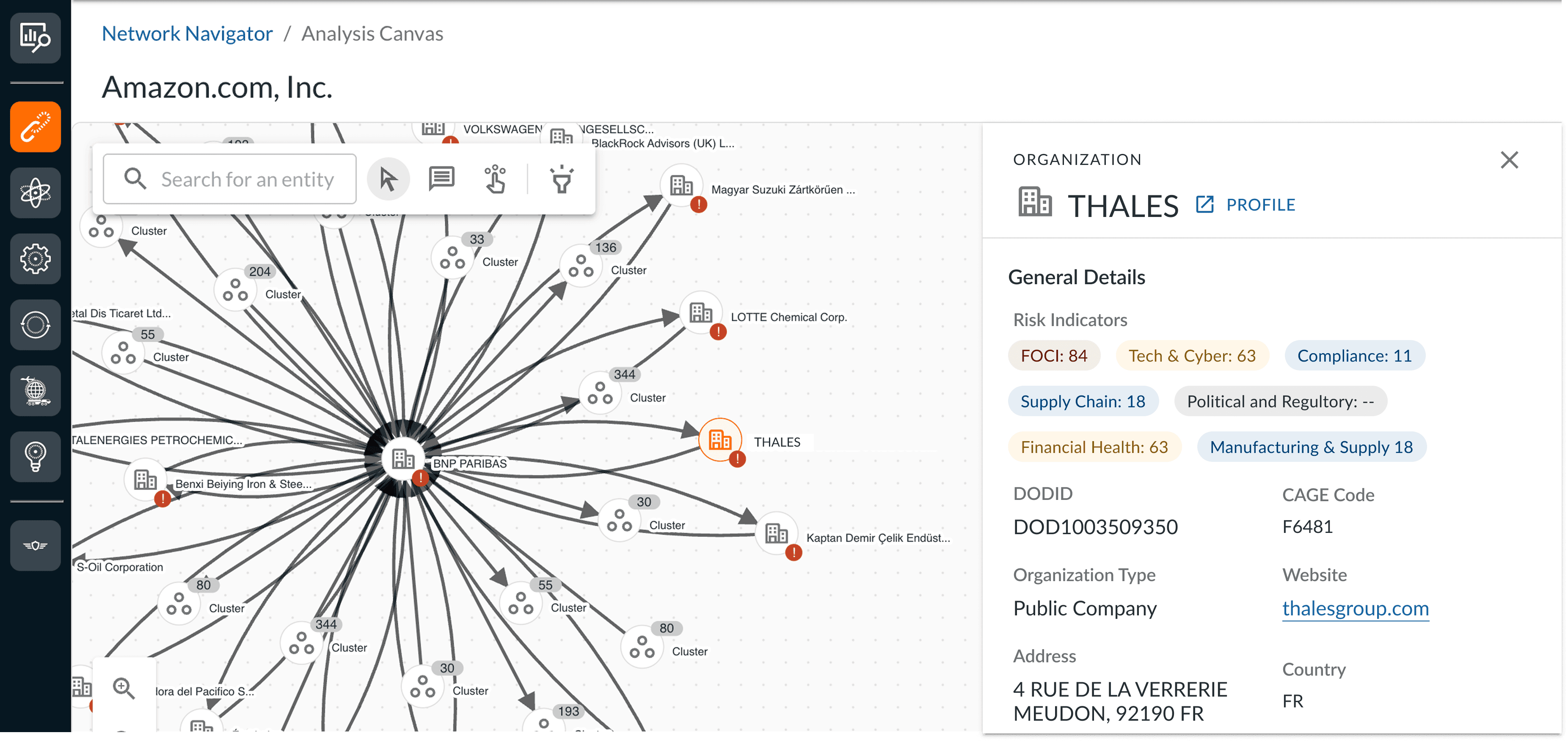 Network Navigator transforms complex supply chain data into an intuitive, explorable network. Analysts can click any entity to view comprehensive summary cards with key risk indicators, financial health metrics, and compliance information- providing immediate context without leaving the graph view.