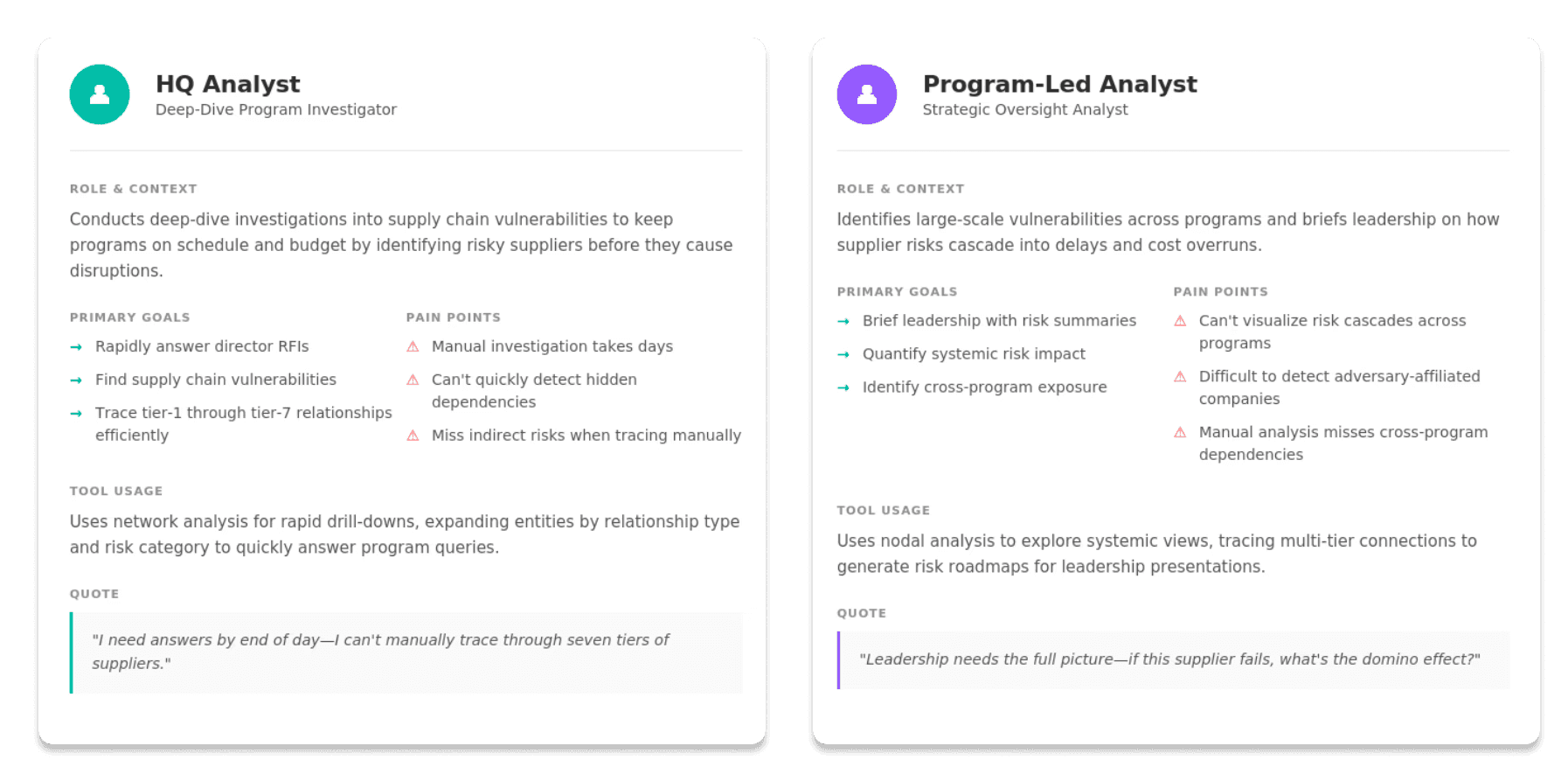 These findings defined our design requirements: build a graph visualization workflow that could instantly surface multi-tier supplier vulnerabilities for HQ Analysts responding to rapid-fire RFIs, while simultaneously providing Program-Led Analysts the systemic network views needed for leadership risk briefings.